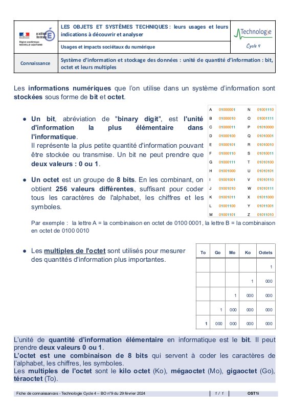 Ost1I Systeme Dinformation Et Stockage Des Donnees Unite De Quantite Dinformation Bit Octet Et Leurs Multiples